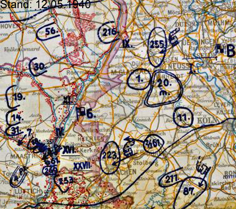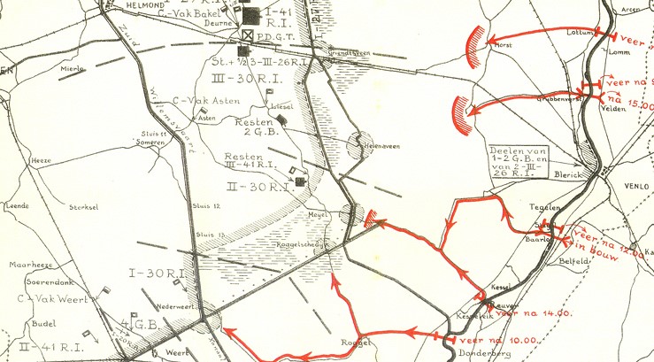 De Duitse 56.ID – dat het centrale deel van de Peel-Raamstelling diende te doorbreken had aan de Maas zeer zware strijd moeten leveren. Daarbij was het de divisie niet gelukt ook maar één overgang intact in handen te krijgen, wat uit de aard der zaak [er waren in hun vak slechts twee bruggen, die bij Venlo], niet heel bijzonder was. Het betekende wel dat men de westzijde van de Maas moest vrij vechten om brugslag te laten plaatsvinden. Door de ontwikkelingen bij Venlo en de opstopping die bij Grubbenvorst ontstond, was het simpele feit aan de orde dat 56.ID zich voor de onmogelijke taak gesteld wist om zich op 10 mei nog te ontplooien tegenover de Peel-Raamstelling. De divisie slaagde er niet eens in haar regimenten volledig over de Maas te krijgen op die eerste oorlogsdag.