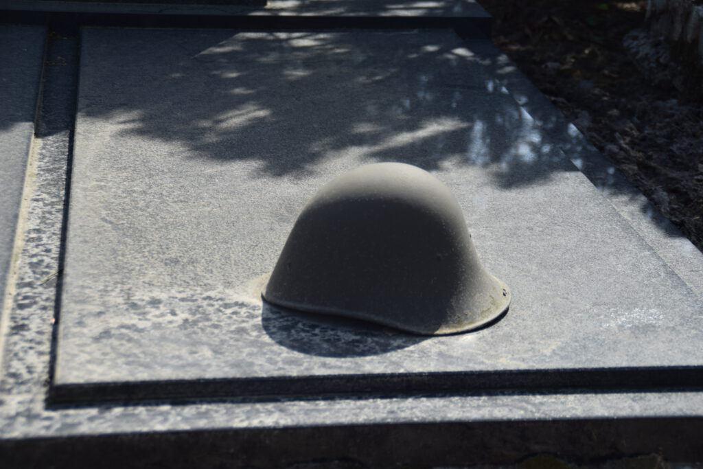 1 Er ligt een Nederlandse staalhelm , type M-27 , op het graf