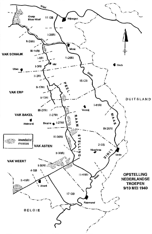 Het “ Vak Asten ” werd door de regimentsstaf van 30.RI [luitenant-kolonel G.E.A. Themann] gecommandeerd. Het had twee eigen bataljons [II-30.RI en III-30.RI] en twee vreemde [III-41.RI en 2.GB] (GB = Grens Bataljon). Naast enige pioniers en de drie Politietroepen detachementen Buggenum/Roermond, Someren en Venlo, had men een deel van de regimentstroepen van 30.RI als enige ondersteuning. Artillerie ontbrak geheel. III-41.RI en 2.GB lagen aan de Maas, de andere twee in de Peel-Raamstelling .